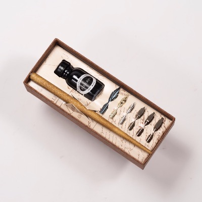 6 plumes: 3 plumes Bandzug  (1/2/3mm) pour l'écriture gothique, 1 plume Cito-fein dorée pour l'écriture cursive ou scripte, 1 plume Pfannen en acier dur pour la scripte, et une plume Sténo aïgue et échancrée en acier bleui, dont la souplesse est idéale pour l'anglaise.